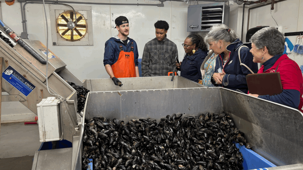 Day Two of the Tour focused on coastal resilience and sustainable mariculture, beginning with a visit to Stone Living Lab’s Living Seawalls in Boston, where Co-Directors Joe Christo and Katherine Dafforn shared how existing infrastructure can be adapted to protect waterfronts from sea-level rise and extreme weather. The Tour then traveled up to Portland, Maine, where attendees joined Luke’s Lobsters co-founder Ben Conniff for a lunch-time discussion on climate impacts to fisheries, as well as the company’s efforts to reduce carbon footprints and mentor future lobster harvesters. Afterwards, the group toured Bang’s Island Mussels, a climate-positive sea farm cultivating mussels and kelp — highly sustainable food sources that also improve water quality and marine biodiversity.