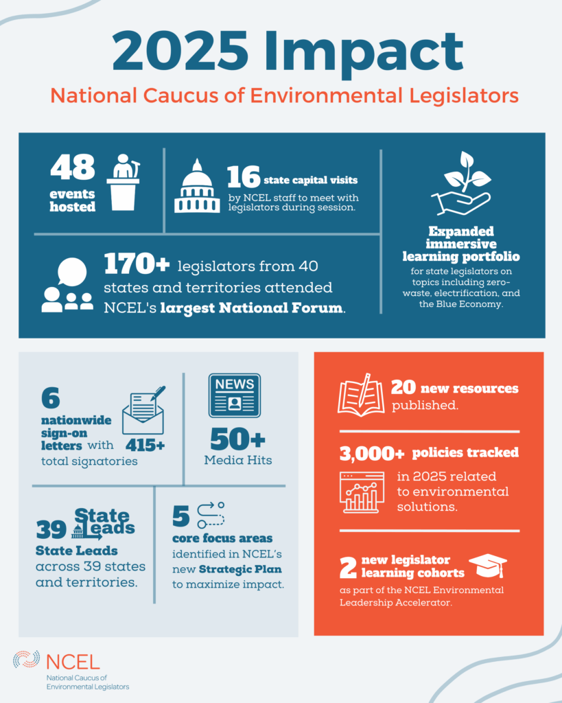 Thank you to all the legislators and partners who made 2025 such a success! As the upcoming legislative session approaches, NCEL is prepared to build on the momentum from 2025. In 2026, we look forward to offering even more opportunities for legislators to deepen their expertise, foster collaboration, and ensure a healthy environment for all. Stay tuned in the new year for a preview of what we’ve identified as the trending policies for the new year.