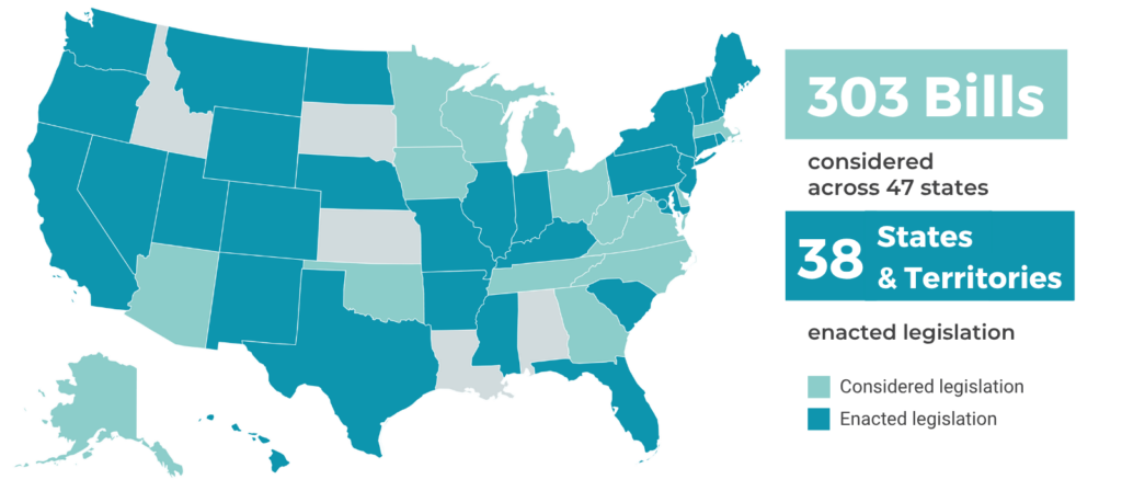Of the over 300 bills introduced this session, 62 bills were enacted in 28 states and territories. This means they became laws. As of early 2026, five additional bills were waiting on a governor’s signature in order to become law.